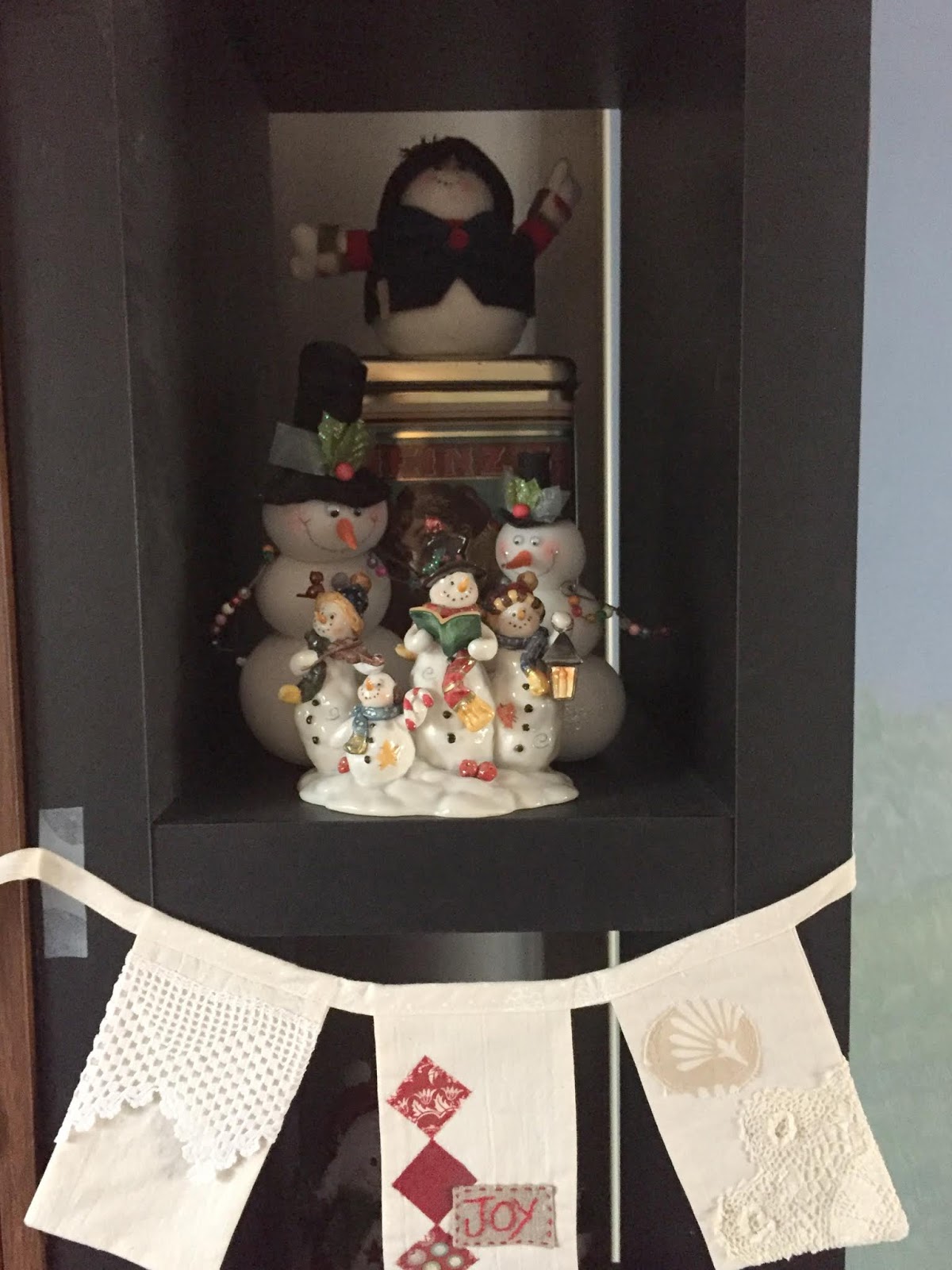Below: My Snowman Collection this year is in a tall set of Ikea shelves. The JOY banner was handmade by a friend: